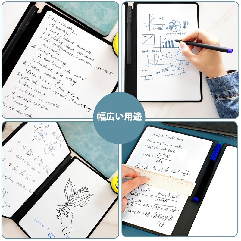 - 【Dry Erase Notebook】This innovative product integrates the notebook and whiteboard with the included extra fine pen to write down your thoughts, planners, diagrams and more. And it can be erased by lightly wiping with a wipe, and it can be used repeatedly, saving papers, and is environmentally friendly. Repeated writing and erasing will look like new