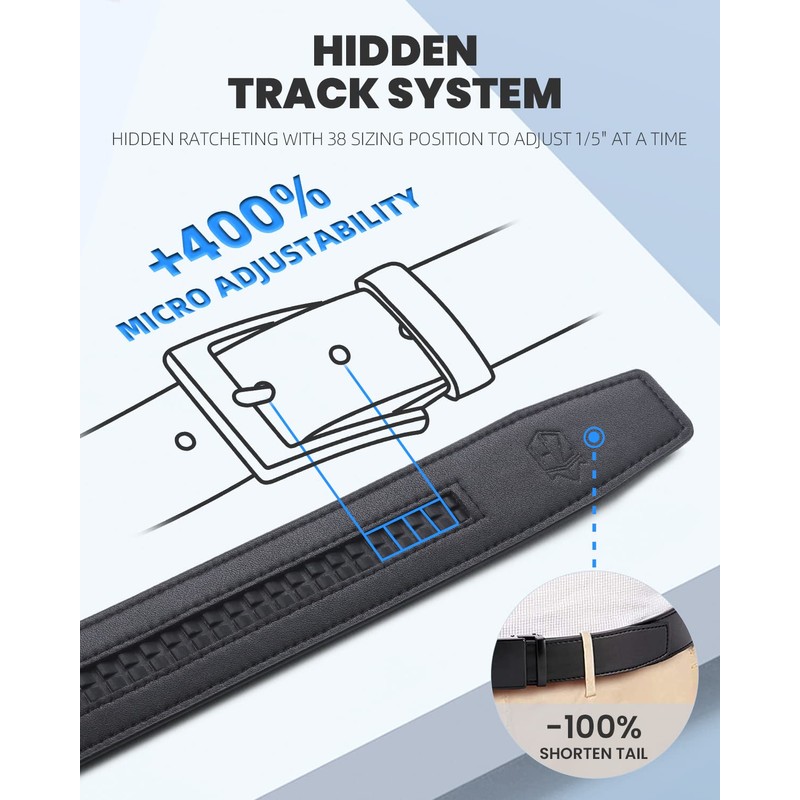- EAST TO USE BELT FOR MEN:Just slide the dress belt into the sliding buckle and pull leather belt through, the ratchet buckle auto-locks.To release the ratchet belt, gently push the release lever on the side of the automatic buckle and lock will snap. Simple, smooth and sleek.