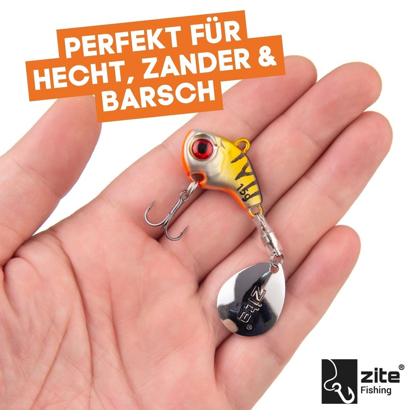 - Spider blade with brand logo: Creates strong stimuli due to pressure waves and light reflections – especially effective for active predators and cloudy water.
