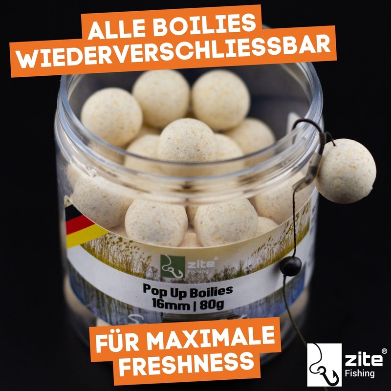 The secret to successful carp fishing lies not only in choosing the right bait, but also in the refined presentation. Our Zite Fishing Pop Up Boilies with the fruity taste of Tutti Frutti, developed in cooperation with Top Secret, are specially designed to float in the water and attract carp. Thanks to their unique texture, they fit perfectly with pop-up mounts. Made from high-quality ingredients, the boilies exude the fruity taste and smell of Tutti Frutti, which magically attracts the carp and leads to great catching results. Packed in a practical, resealable tin with 180 g content, the boilies always stay fresh and their attractive effect.