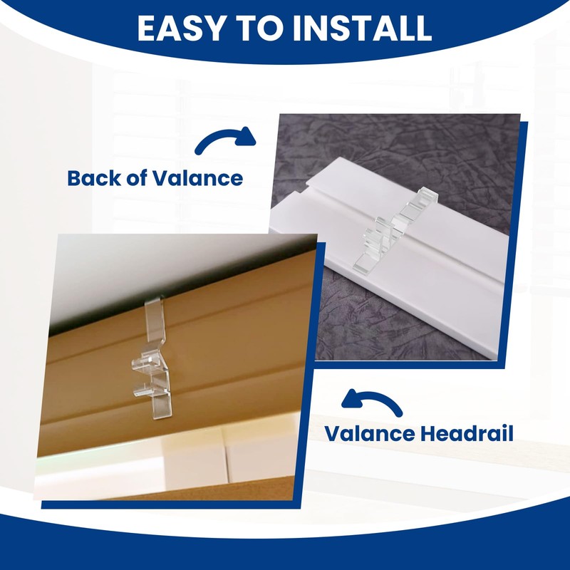 - 【Easy to Install】The clips for blinds valencer is easy to install. No drilling required, just simply slide the clips into the grove on the back of your valance, then slide the valance over and onto the horizontal rail at the top of your blind