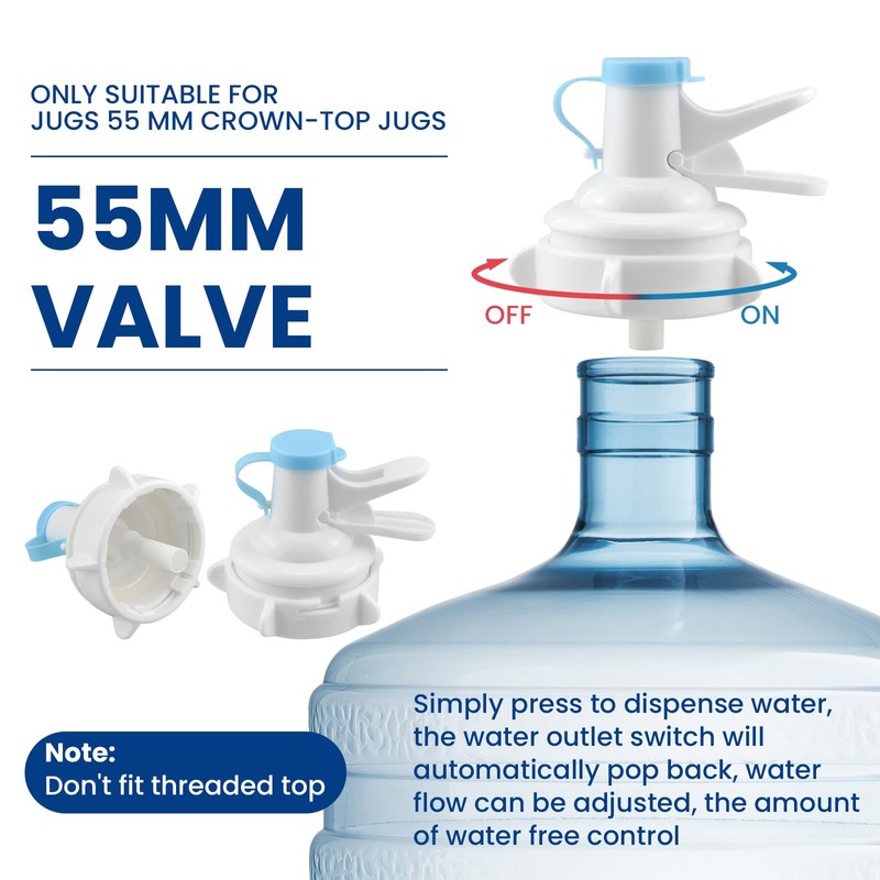 - 𝗦𝗶𝘇𝗲 𝗮𝗻𝗱 𝗔𝗽𝗽𝗹𝗶𝗰𝗮𝗯𝗹𝗲: Only suitable for jugs 55 mm crown-top water jugs without threads , not suitable for 48 mm threaded caps. Suitable for 1-5 gallons jugs from all brands