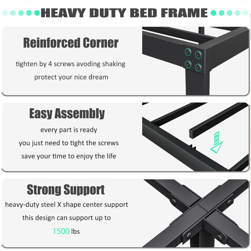 - 【Sturdy & Durable】Queen bed frame is constructed with 9 support legs and 10 heavy-duty steel slats, with a load-bearing capacity of up to 1500 pounds, which can meet the needs of most families.