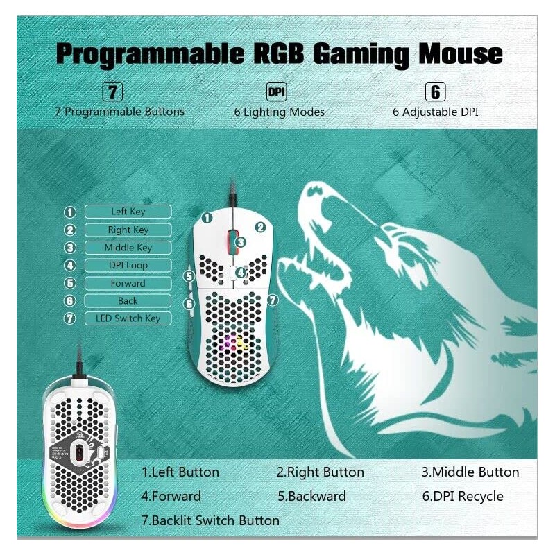 - Diseño de 7 botones: contiene 6 botones programables y 1 botón RGB, ajuste de sensibilidad de Offerson-the-Fly a través de botones DPI dedicados (reprogramables) para juegos y trabajo creativo. Nota: los botones RGB no se pueden programar.