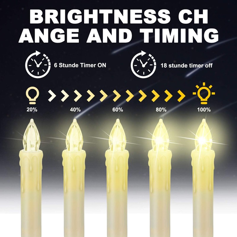 - LED candles with remote control: 7-button remote control with timing function, infrared remote control with a unique code so that candles do not interact with other electronic products. The 6/18-hour mode (6 on / 18 off) can be adjusted to save energy; with static and flashing mode; you can adjust the flashing effect and brightness.