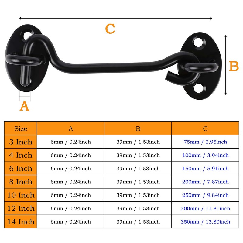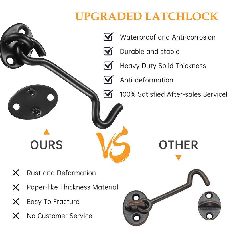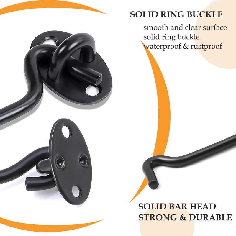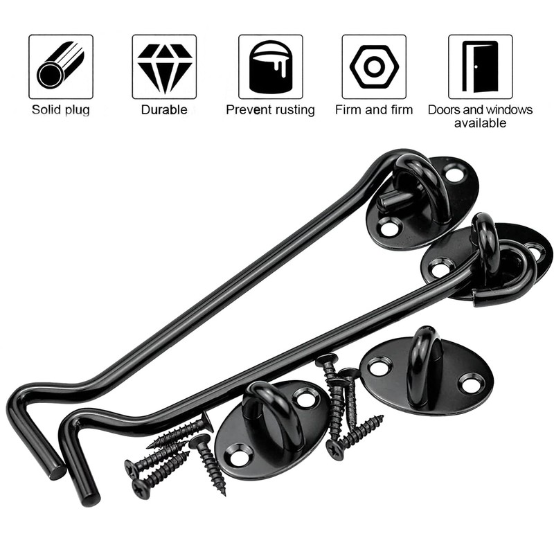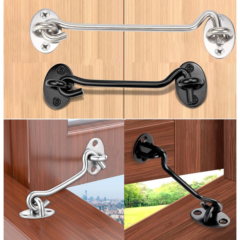 - Keep Safe & Privacy: The door hook and eye latches has a solid buckle design, a thick base reinforced with rivets, and an integrated thickened wall hook to prevent detachment. It is used for locking cabinet doors and can also be used as a positioning door hook. Door latch could either keep the window closed or partially opened to avoid hidden danger that active younger or pets might climb windows or go out.