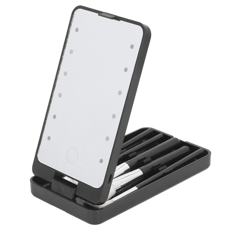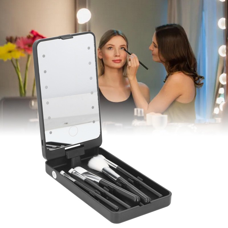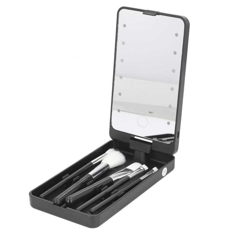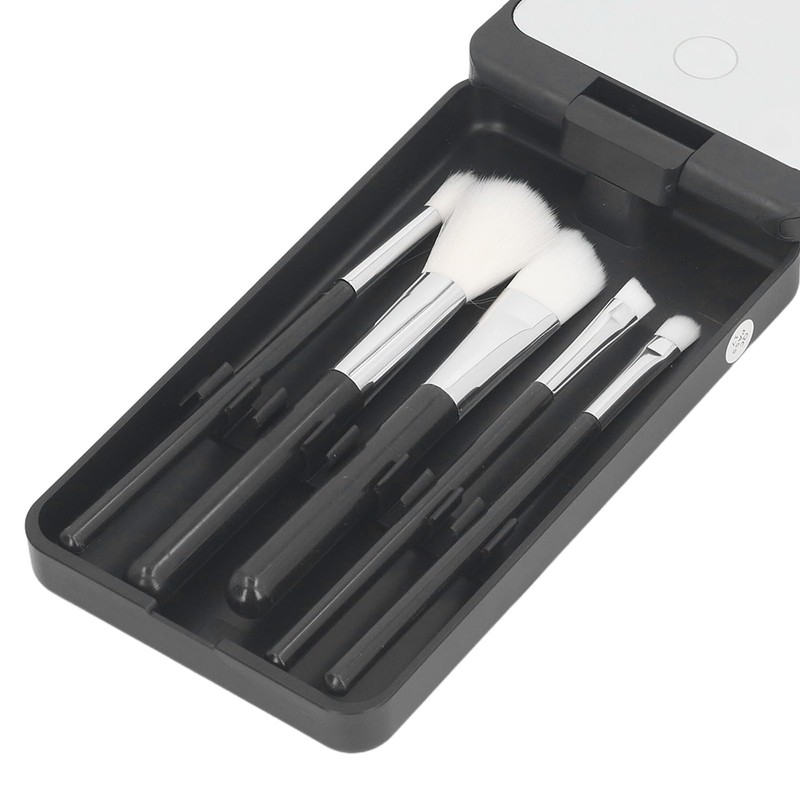 ZJchao Espejo de Bolsillo con Luz LED con 5pcs Brochas de Maquillaje, Organizador Brochas Portátil, Espejo Viaje Plegable Recargable, Negro
