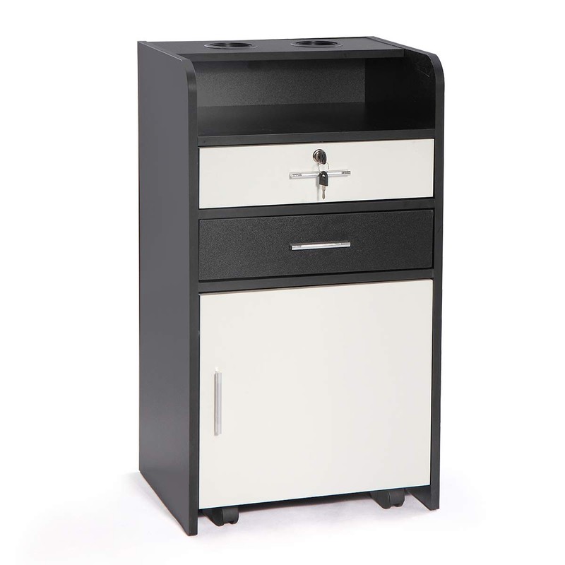ZJMTOCYU Efficient Salon Styling Station with 2 Drawers, Hair Dryer Holders, and Cabinet, Compact Design, Black and White