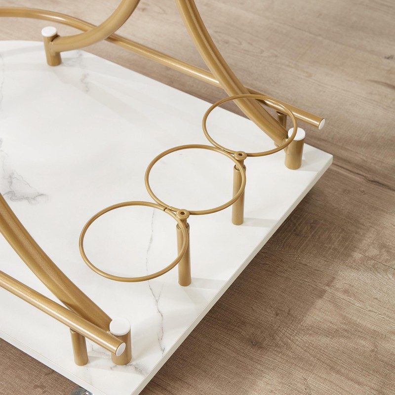 Stylish Design Meets PracticalityWith a golden frame and a chic faux marble-patterned top, this bar cart is not just functional, but also a stylish addition to your decor. Its sleek lines and refined touches transform , providing a beautiful focal point in your dining room or kitchen while complementing your style.