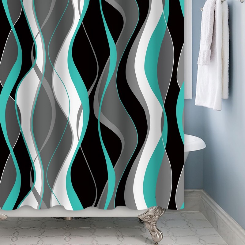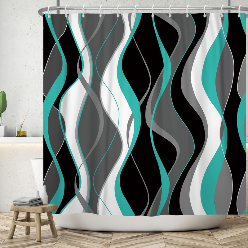 - 【Modern Abstract Design】Featuring a striking combination of teal, black, grey, and white stripes, this shower curtain adds a bold and stylish touch to any bathroom.The modern abstract design complements various bathroom decor styles, adding a contemporary flair with a minimalistic aesthetic.