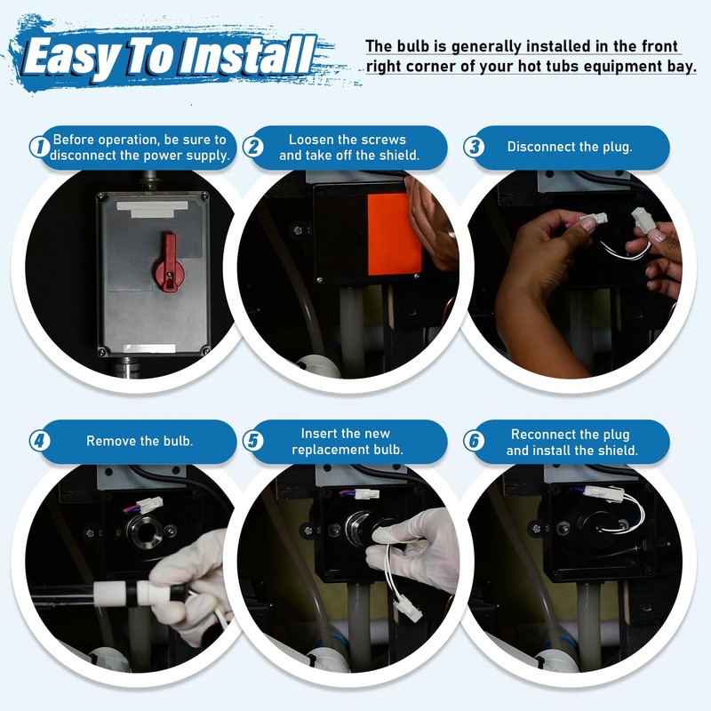 - 【Easy To Install】The spa UV light bulb is installed in the hot tub, remove the screws, enclosure cover and gasket in place, slide the UV bulb back inside the quartz tube, easy to operate.