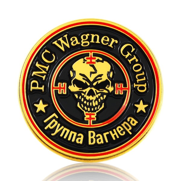 - A pin badge with a wagnel emblem motif. The design has a message to the military industry