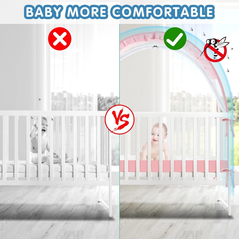 High quality stainless steel bracket with rounded edge at the top, solid crib cover bracket, good support, baby crib tent is not easy to collapse. The interior space is large, the baby can move freely, and the sleep will not be too crowded. It's also easy to install!