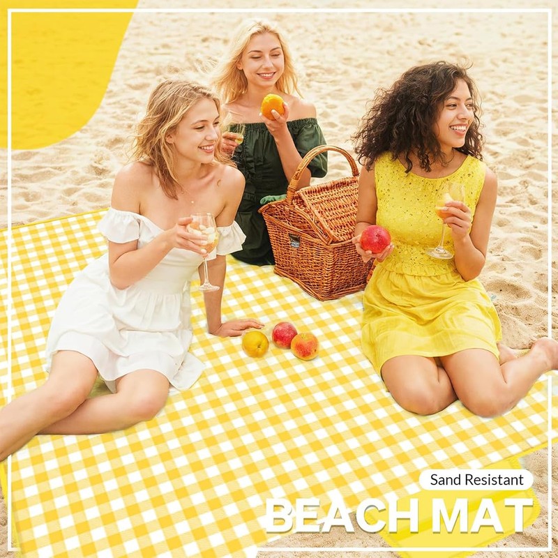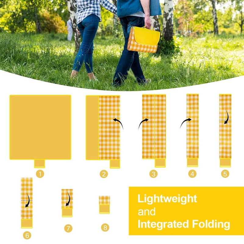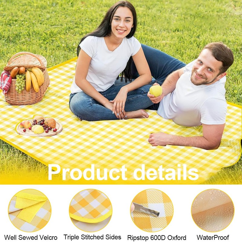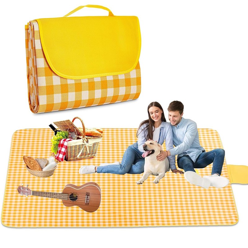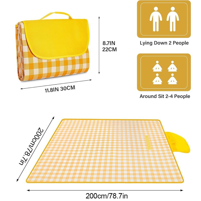 - Extra large size: picnic blanket has a yellow and white checked pattern, the simple and stylish pattern is sure to impress your family and friends. With a size of 200 cm x 200 cm (folded to 30 x 20 cm), this picnic blanket offers enough space for 3-6 people who can lie down comfortably and offers protection, comfort and portability.
