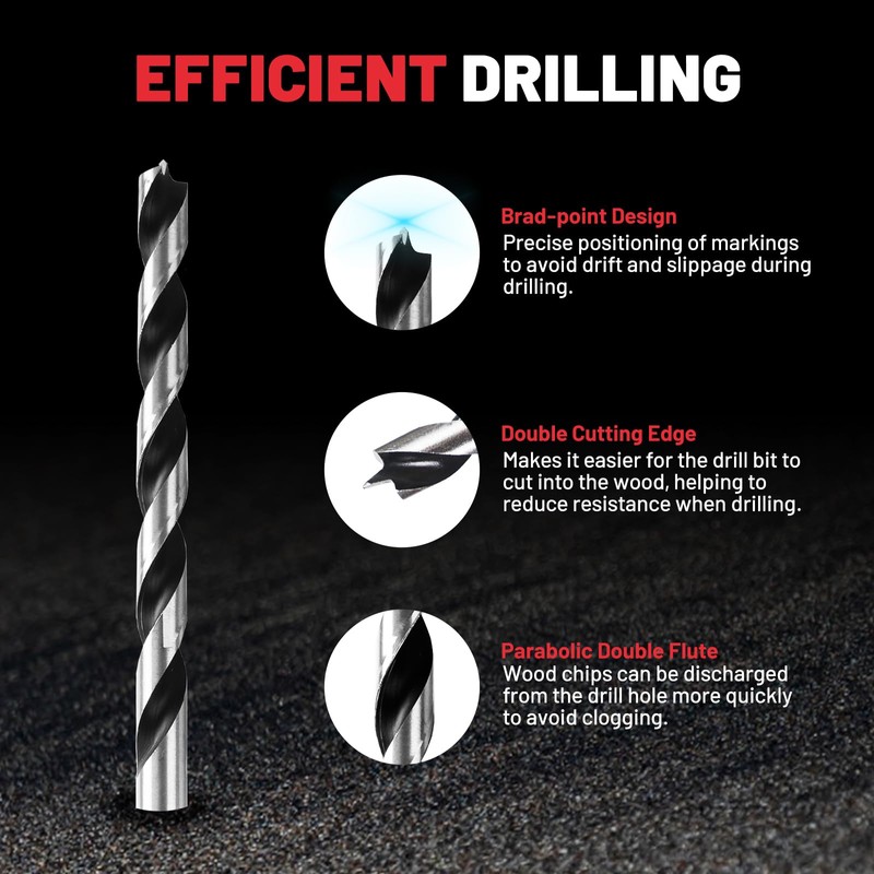 • 【Brad-point Design】The brad point drill bit set features a protruding sharp point at the tip that helps to accurately mark the drill location and effectively prevents deviation and slippage during drilling. This design reduces wood damage and produces smooth, flat hole walls.