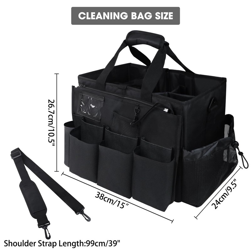 - Large Capacity Storage: The wearable cleaning bag external size: 14.96" x 9.25" x 10.82"; Professional partition design makes housework more organized and easier. This cleaning organizer bag is good for cleaners, housekeepers.