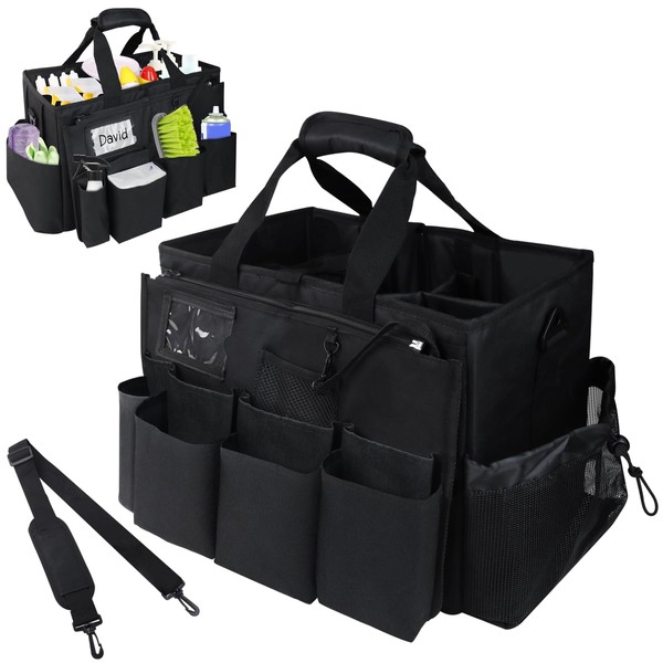 - Multi Pockets Design: There cleaning caddy organizer are 5 spacious compartments inside the main body for organizing cleaning tools. 7 separate exterior pockets, 1 small mesh pocket, 1 business card slot, 1 large mesh side pocket and 1 trash bag dispenser on each side, 1 Large zipper bag. It's easy to organize and sort your cleaning tools and items.