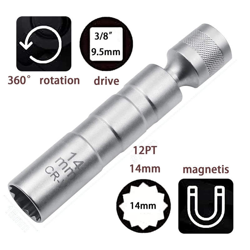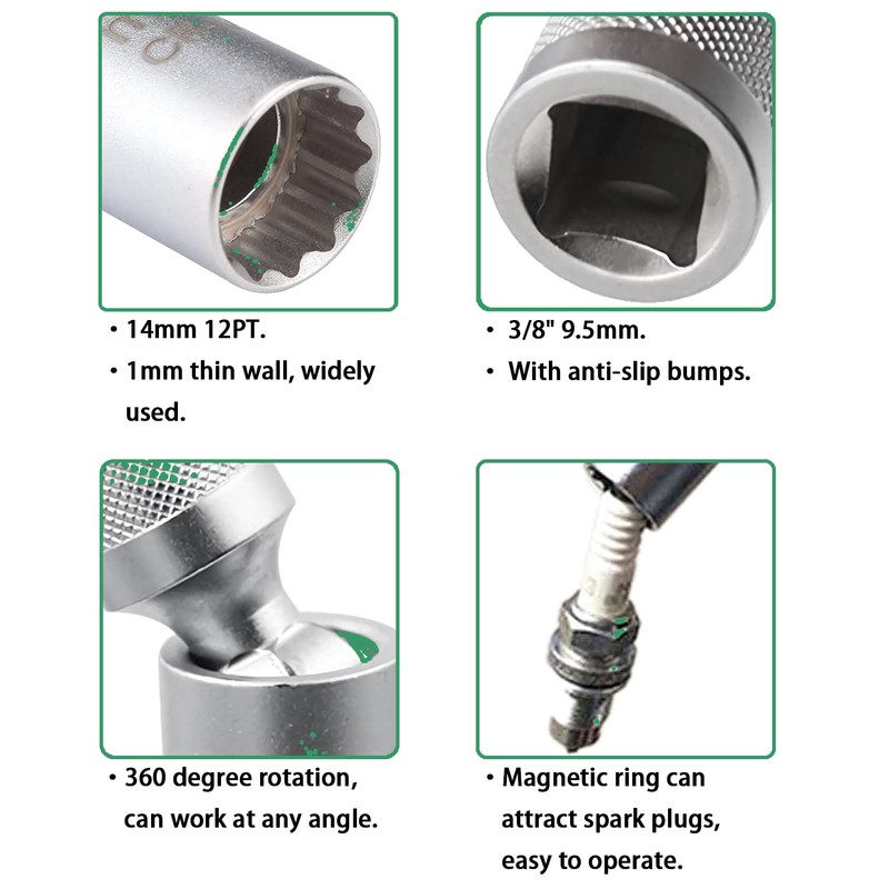 This magnetic spark plug socket both of end have plenty strong magnet, swivel head could hold on ratchet firmly fixed, the top could attract spark plugs, not easy to loose the plug when installing/removing, more easy and efficient.