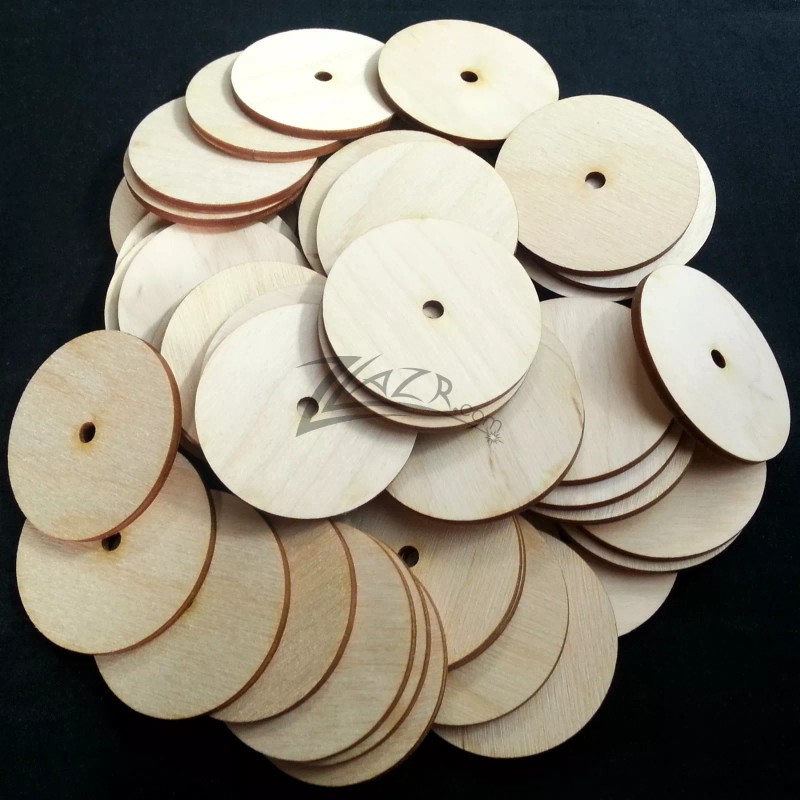 Laser cut wooden circle disc. Includes 50 circle pieces: 2" diameter at 1/8" thickness (approx.) with 1 Hole in the center of each disc. These circles are made from a great sturdy real hard plywood material. These are great for adult or kids craft projects, games, scrapbooking or even drawing. They are an unfinished wood and are easy to paint.