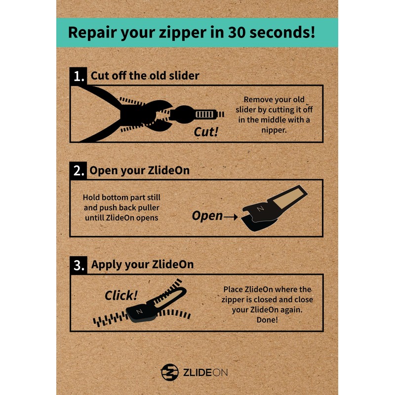 - Replace zip quickly & easily - you don't need to buy a new jacket or a complicated zip repair kit, ZlideOn keeps your back free. It is super easy and takes less than half a minute.