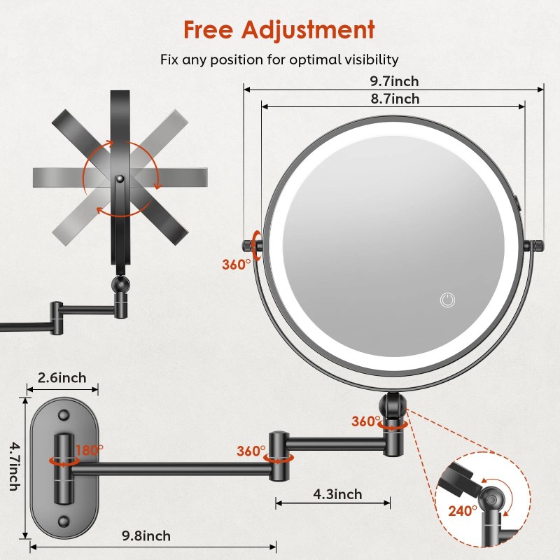 360°Rotation & Extendable Arm Makeup Mirror: The multiple joints of the wall-mounted makeup mirror with retractable arm allows you to fix the mirror in the best position and adjust the arm to any angle you need to achieve perfect viewing.The flexible mirror arm can be freely extended so that the magnifying mirror can be adjusted to the right viewing angle and distance, allowing you to freely apply makeup,shaving or wearing contact lenses, etc. You can fold the mirror on the wall to save space when you are not using it.
