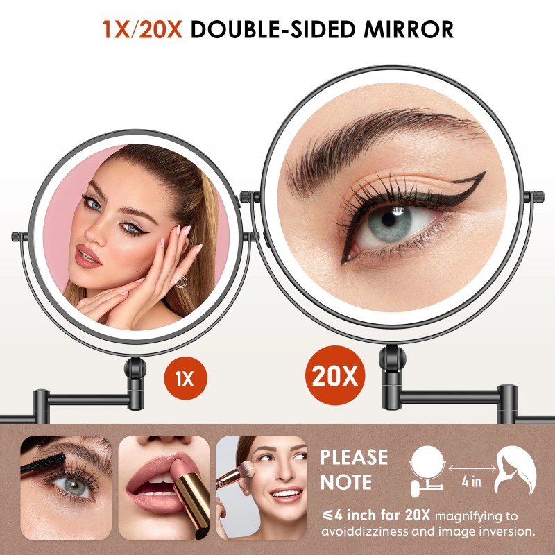 Double Side 1X/20X Magnification Mirror: 9 inch lighted makeup mirror has 1X high definition and 20X magnification mirror face. 1X led Light makeup mirrors function is designed to observe the entire face of an individual. The 20x led makeup mirror function is used for larger facial details. For example:Wearing contact lenses, trimming eyebrows, facial treatments or applying mascara. Note: You should be at least with a distance of 4 inches to mirror for a more detailed and less distorted image or dizzying.