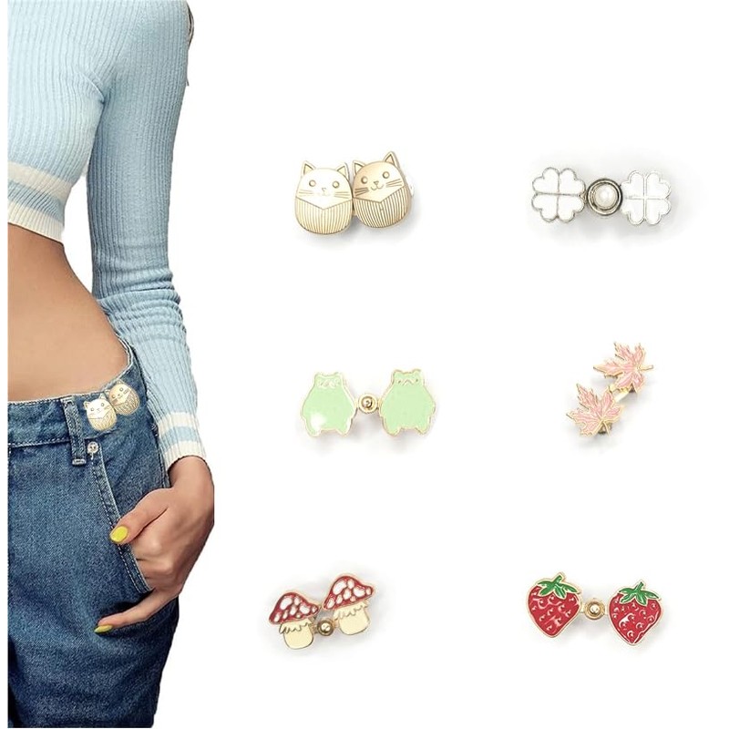 • 【Product Included】You will receive 6 pieces of jean waist tightener, 6 styles, 1 set of Cat, 1 set of Four Leaf Clover, 1 set of frog, 1 set of strawberry, 1 set of mushroom and 1 set of four leaf clover, it will help you adjust the size of your pants and skirts