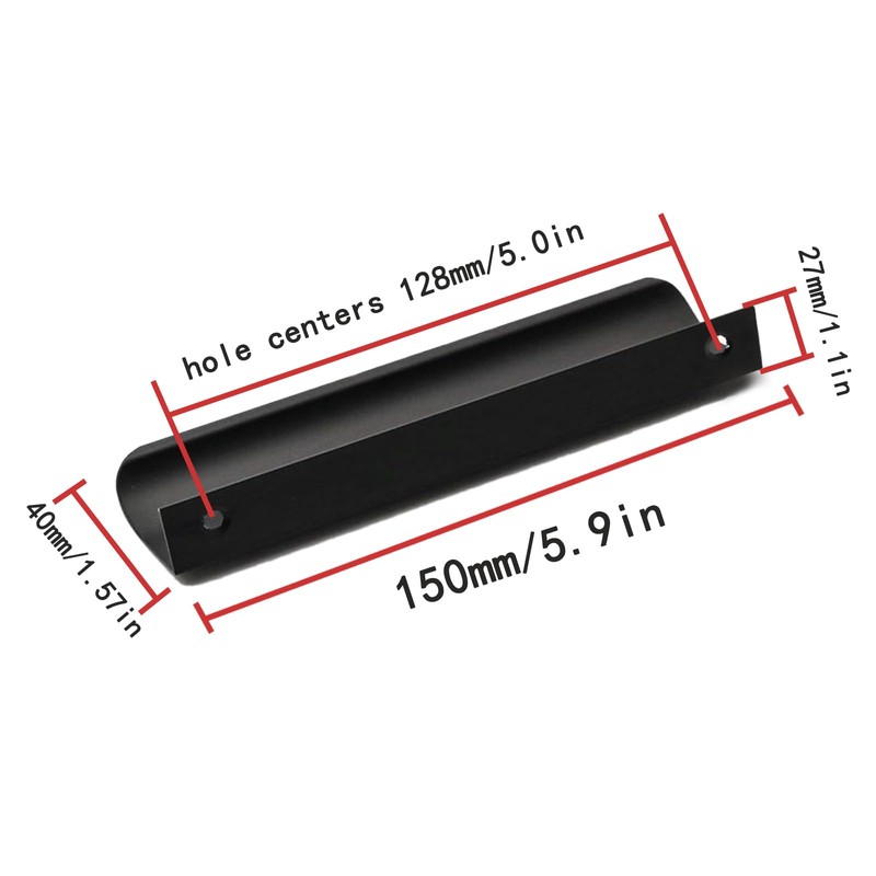 Product Description Specification Product name:Finger Edge Pull Furniture Drawer Handles Hidden Cabinet Kitchen Drawer Handles Knobs. Color:Black. Material:aluminum. Size:150mm x 40mm/5.9in x 1.57in,hole centers 128mm/5.0in Package contents:4 pcs+matching screws Note Due to manual measurement,allow a deviation of 1-2mm. Please check our product size carefully and read the product size descriptions before purchasing to avoid possible unpleasant shopping experience.