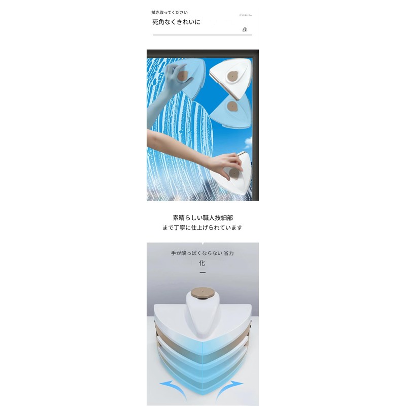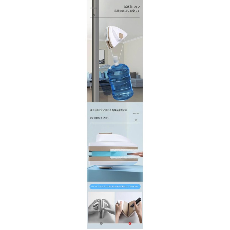 - Magnetic double sided window cleaner Cleans windows quickly and effectively by washing and drying both sides of the window at the same time doubles results in half of your effort. Can be used on windows, shower screens, mirrors and glass surfaces... Specifications: Product: Double side window cleaner Material: Plastic + Magnetic + Rubber Application range: 3-8mm 5-12mm 15-24mm 20-30mm glass