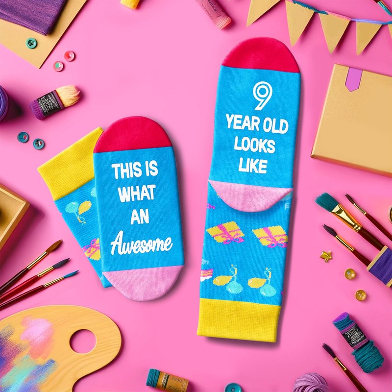 - GIFTS FOR CHILDREN: These socks feature birthday gifts, balloons, cakes, and other elements on the top, while the bottom features a hilarious secret message written in non-slip ink: "THIS IS WHAT AN Awesome 9 YEAR OLD LOOKS LIKE." They are suitable for any holiday gifts, such as Birthday gifts, Christmas gifts, or White Elephant gifts.