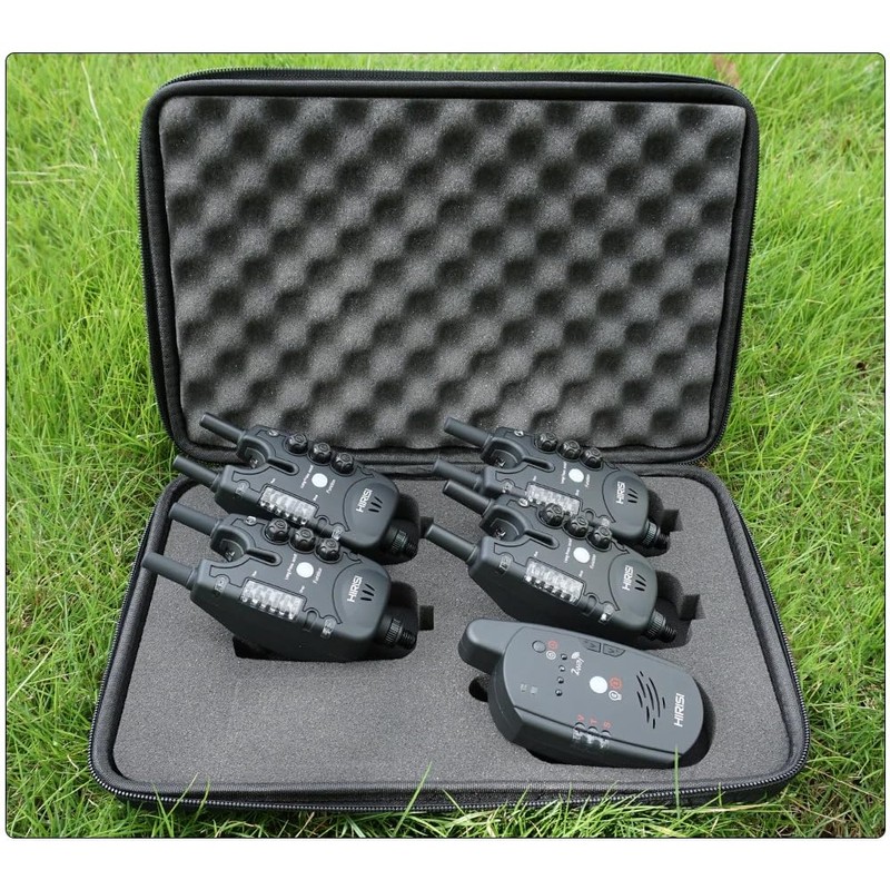 - Wireless transmission range: over 150 meters Additional jack for illumination swing in PU case with protective zipper Specifications: Material: Durable ABS Water Resistant: Yes (suitable for rainy weather) Remote control: Two-way wireless signal Battery life: 1 9V battery for bite alarm, 3 AAA batteries for receiver; Transmission range: Wireless transmission range: over 150 meters Function: Volume, Tone, Sensitivity adjustment function, Night light, Anti-theft function, High output speaker and warning LED light , Signal Memory LED ( 20 seconds), extra jack for illumination swing and protective zippered PU case features: | Bite Indicator | Enhance your fishing experience The Hirisi Carp Fishing Alarm Set is a state-of-the-art fishing accessory designed to enhance your fishing experience. This Wireless Bite Alarm System (Model S8) features a bi-directional remote control that allows you to adjust the volume, tone and sensitivity of the alarm from a distance. High power speaker and warning LED light make sure that whether you're a seasoned angler or a beginner, the S8 set will not miss any bite. The Signal Memory LED lights up for 20 seconds and reacts to capture the prey in a long time