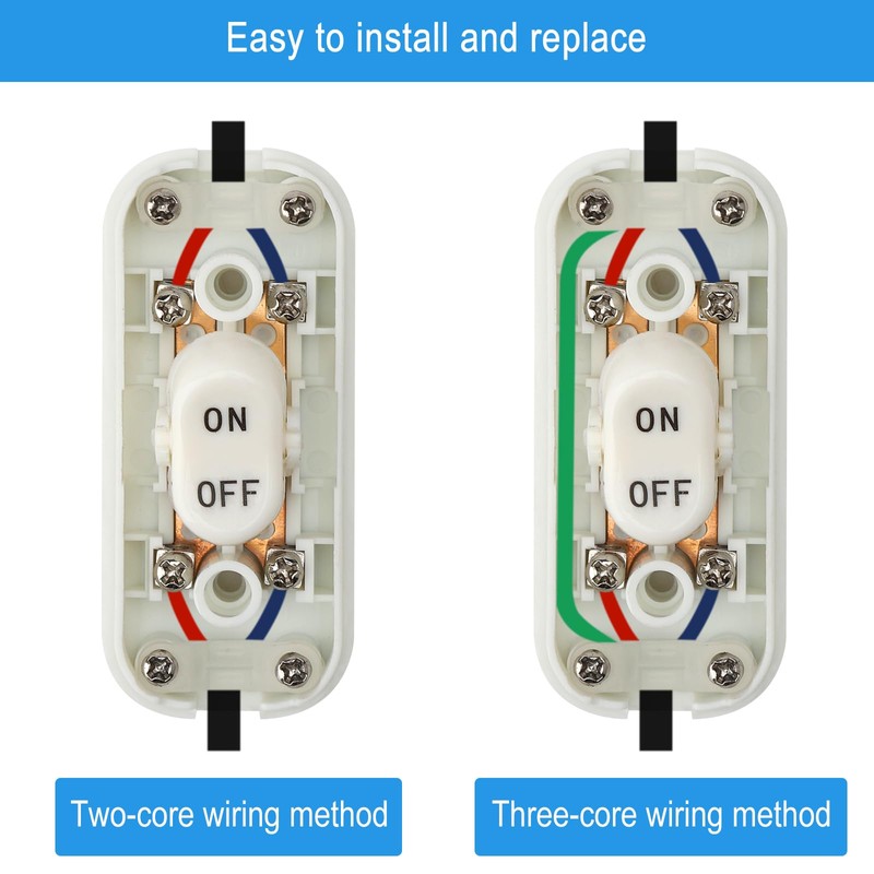 • Easy to install: On off switch 250 V with screw terminals to attach, no need to weld, easy to install. You can use a two-wire connection or a three-wire connection. Simply insert the corresponding wires into the wire holes of the 2-pin cord switch, close the housing and tighten it to complete the installation. Supports fibre optic cables with a diameter of up to 6.5 mm