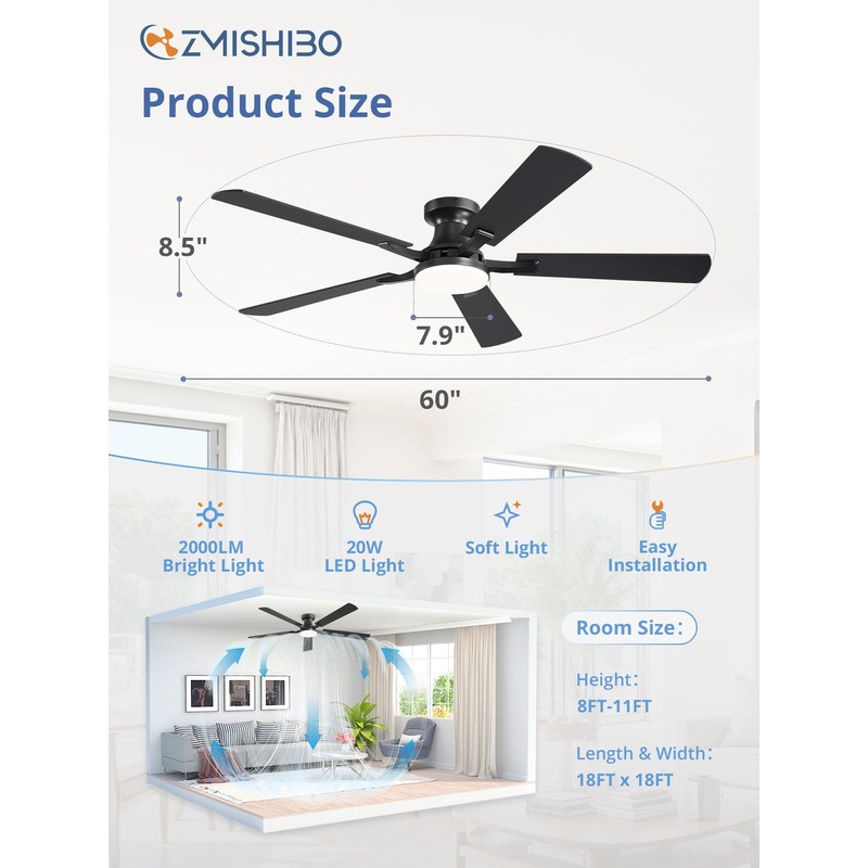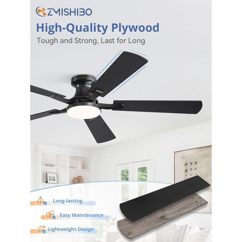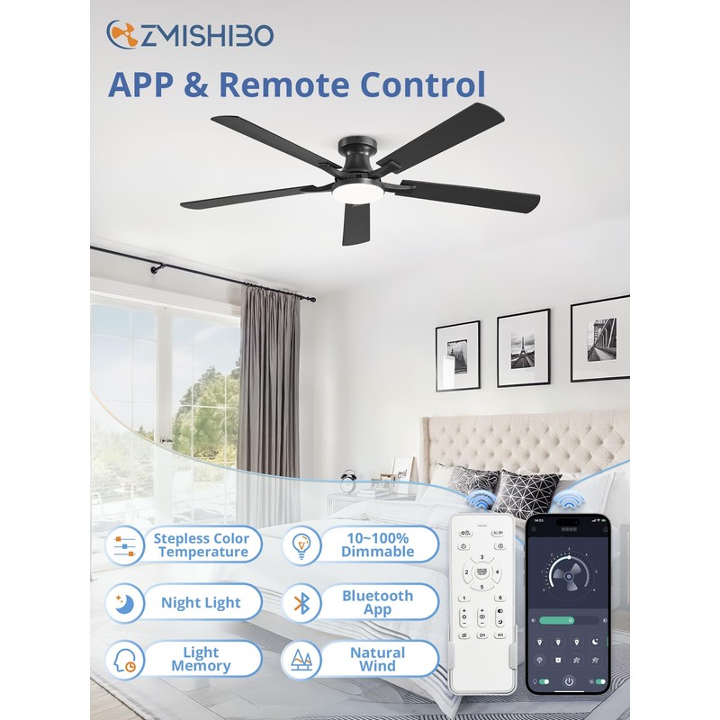 ZMISHIBO 60 Inch Ceiling Fan with Light, App&Remote Control, Flush Mount Low Profile, Dimmable 20W LED Light, Quiet Reversible Motor for Bedroom, Living Room, Apartment, Black