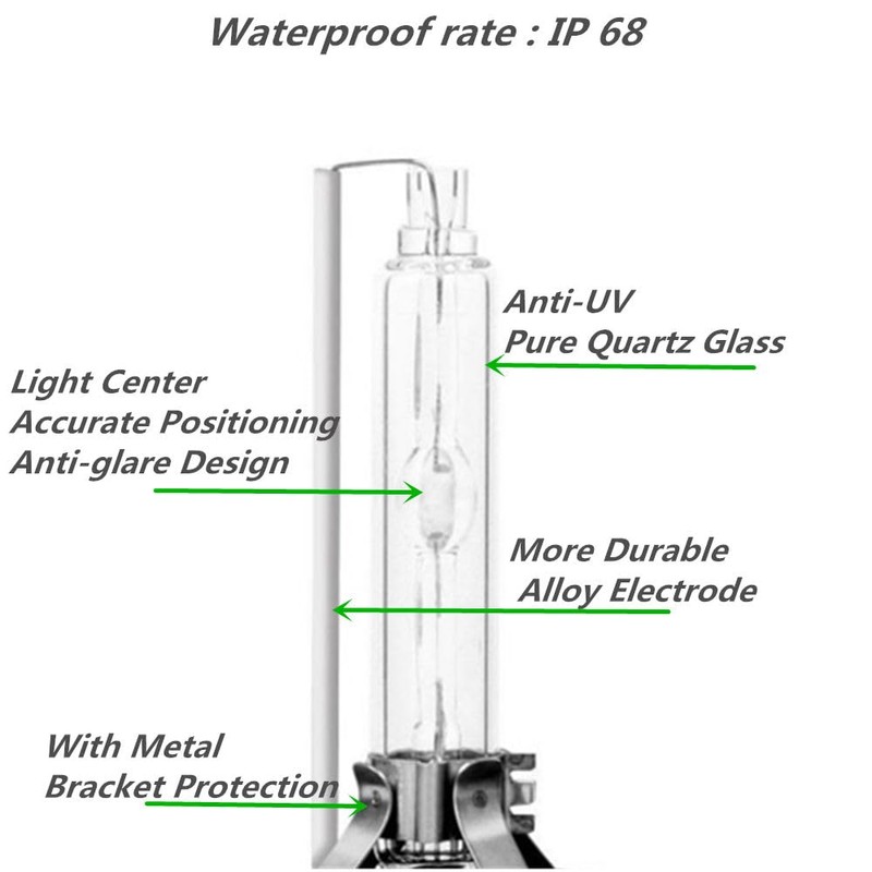 - Bulb Type: D1S, Light Source: HID Xenon, Color Temperature: 4300K, Power: 35W, Working Voltage: DC 12V, Expected Life: 3500 Hrs, Waterproof Rate: IP 68, Intended: For Front Headlight Xenon HID Bulbs, Compatible with High Beam and Low Beam. (fully compatible as long as your current bulb is 'D1S 12V 35W' type.)