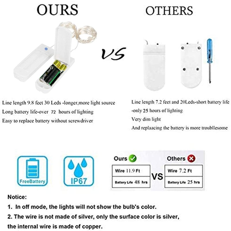 - DECORATIVE FAIRY LIGHTS: The fairy lights battery operated with timer are perfect for birthday party, wedding, bedroom, kids room, dorm, Mason Jars, umbrella, garland, or any other unique handicraft projects,also widely used in Christmas, Halloween,Valentine's Day,Festival,etc.