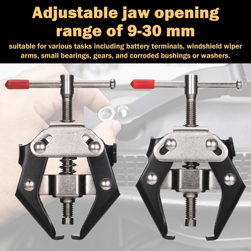 • Adjustable jaws: The adjustable jaw opening range of the wiper arm puller is 9-30 mm, making it suitable for a variety of tasks, including battery clamps, windscreen wiper arms, small bearings, gears and corroded bushings or washers.