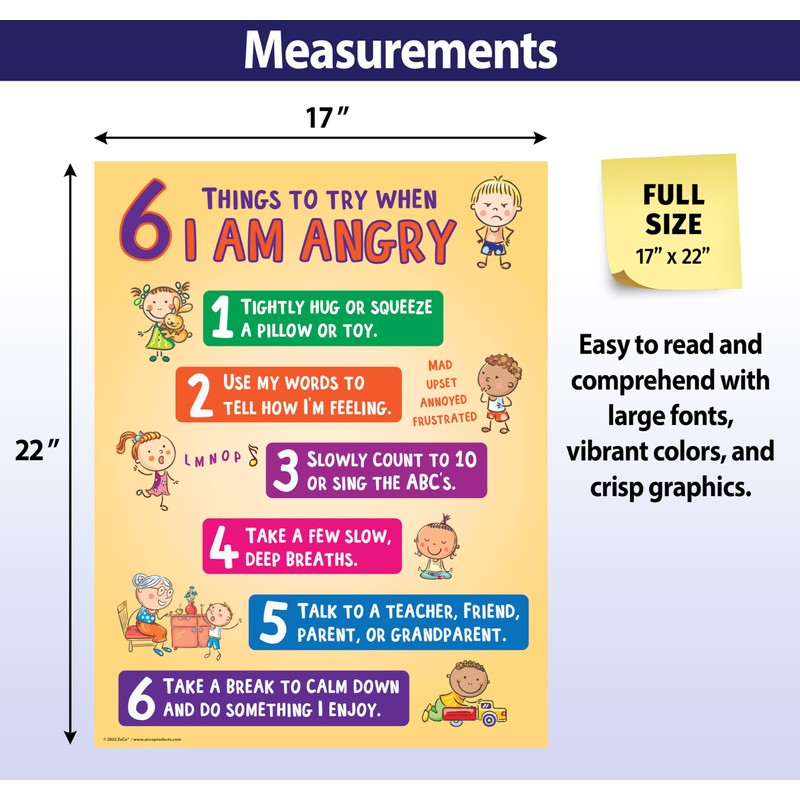 - FULL SIZE POSTERS — Each poster measures 17 inches x 22 inches. Visible at a distance, this emotional regulation poster is ideal to hang in play rooms and study areas, in calm down corners, in classrooms, or in the school counselor's office.