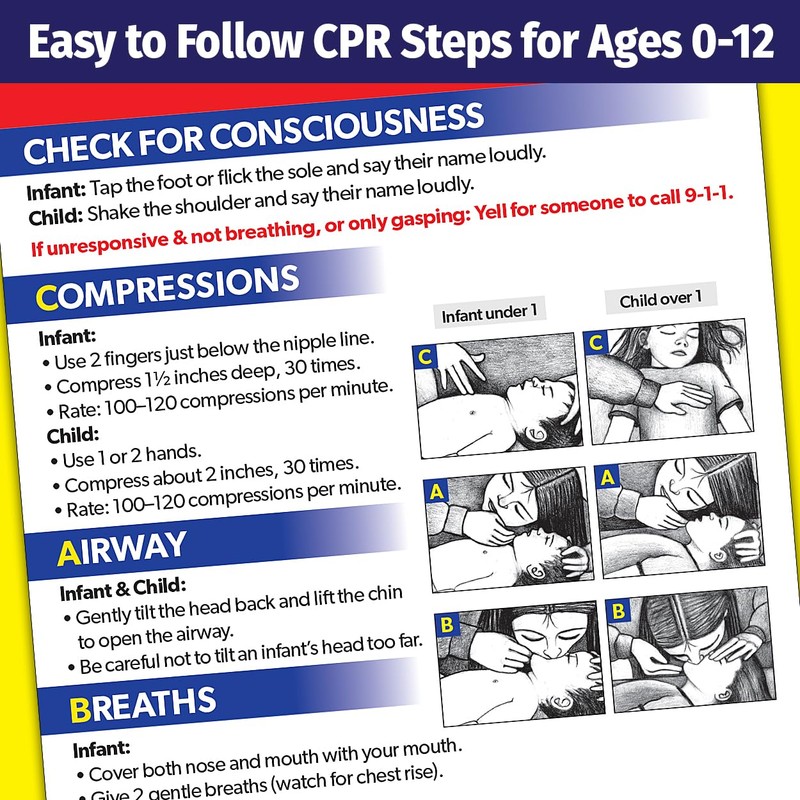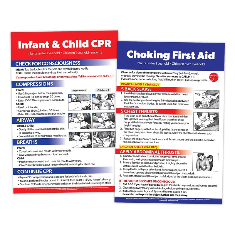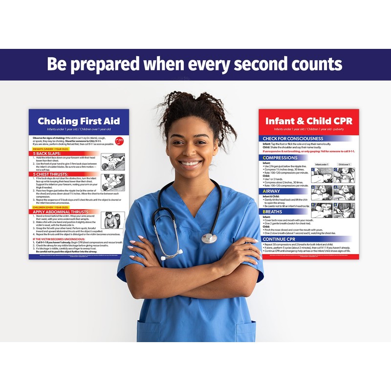 - 2 Pack: Infant & Child CPR Poster – Covers essential Infant and Child CPR steps in a clear, easy-to-follow format; a valuable addition to any first aid kit, classroom, or training space. Infant and Child Choking Poster – Clearly outlines how to respond to choking emergencies using age-appropriate techniques, including the Heimlich maneuver; a valuable addition to any CPR or first aid kit