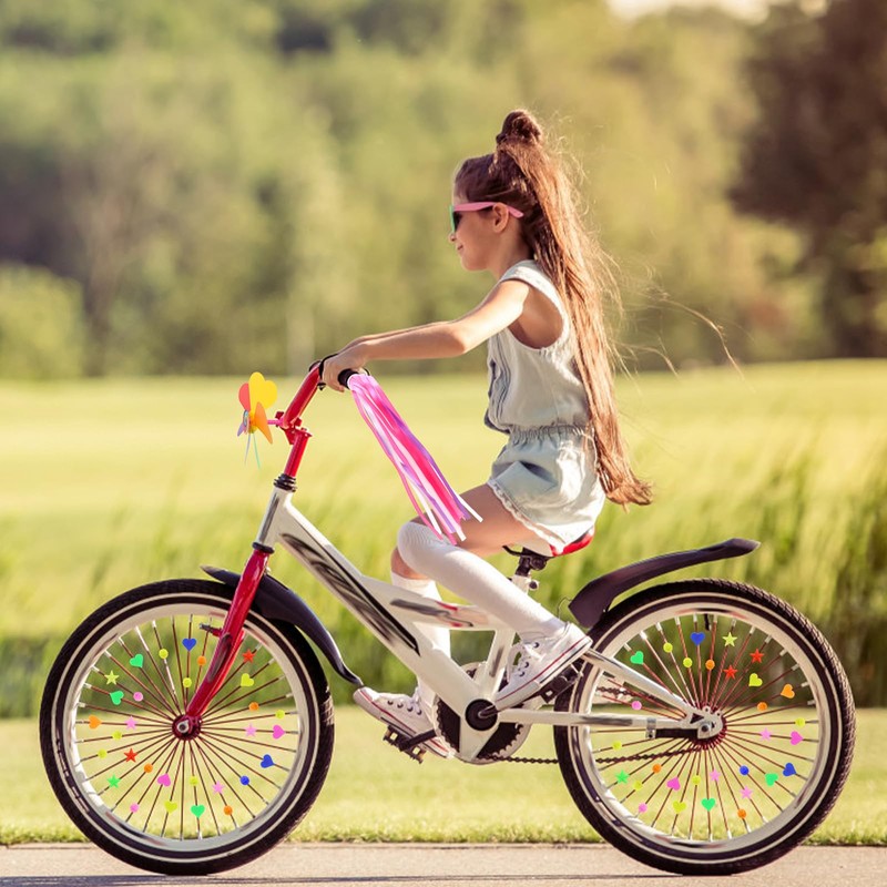- PACKAGE INCLUDES You will get 70 circles, 70 stars, 70 hearts, 1 pair of bicycle handlebars, 1 small windmill, the colorful spoke beads add to the attractiveness of the bike. Bicycle spoke clips in vibrant and vibrant colours can easily attract your attention and brighten up your mood.