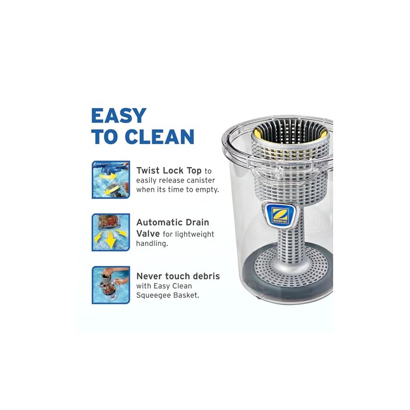- Never Touch Debris The large capacity canister with easy clean strainer basket with squeegee bottom has an ergonomic handle so you never have to touch debris.