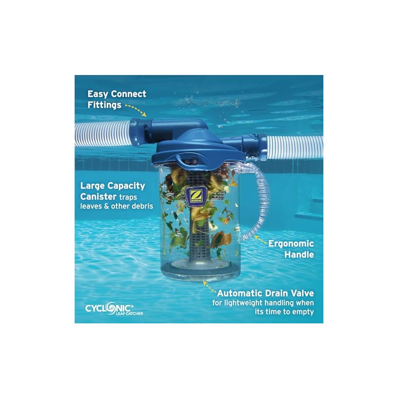 The Cyclonic Leaf Catcher for Suction Side Pool Cleaners CLC500 is a leaf canister that easily attaches to most suction side pool cleaners. This leaf canister traps leaves before they reach your skimmer or filtration system helping your existing equipment last longer. It's Advanced Cyclonic Technology keeps the unit unclogged keeping the dynamic water flow moving. This Cyclonic Leaf Catcher is compatible with most suction side pool cleaners as it works with turbine-driven and disc-style models. Universal hose connections are included to help fit in your hosing. Zodiac's Cyclonic Leaf Catcher is a great way to control the amount of debris in your pool without wearing on your filtration system too much. Keep your swimming pool clear of any dirt and debris with the Cyclonic Leaf Catcher by Zodiac Pool Systems.