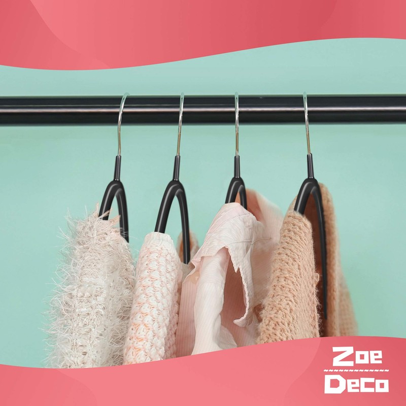 WHY YOU'LL LOVE IT At Zoe Deco, we understand how difficult it can be to keep a tidy closet. So, we have developed hangers that aid in the decluttering and organizing your clothes. These hangers are meticulously crafted with the user and their living space in mind. Get hangers that maximize space, simplify organization, and take the guesswork out of keeping a neat wardrobe. Our Zoe Deco hangers are the ultimate hangers in luxurious home organization! SPACE SAVER & GRIPPY The slim and sleek design allows you to maximize space in your closet while keeping your clothes secure. The durable and sturdy design can hold clothes up to 18 pounds. They are lightweight, extremely durable, and feature a non-slip dip-coated exterior to keep the garments in place. BETTER GARMENT CARE Zoe Deco hangers feature a non-slip heavy-duty metal material with plastic dipping that holds clothes in place without falling or sagging. The arc-shape shoulders keep your clothes free from creases and bumps. Get a neat and organized closet with these premium-quality, uniform hangers in black or white, packs of 10.