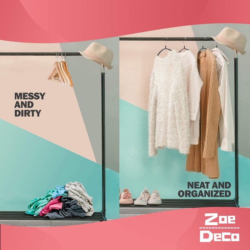 WHY YOU'LL LOVE IT At Zoe Deco, we understand how difficult it can be to keep a tidy closet. So, we have developed hangers that aid in the decluttering and organizing your clothes. These hangers are meticulously crafted with the user and their living space in mind. Get hangers that maximize space, simplify organization, and take the guesswork out of keeping a neat wardrobe. Our Zoe Deco hangers are the ultimate hangers in luxurious home organization! SPACE SAVER & GRIPPY The slim and sleek design allows you to maximize space in your closet while keeping your clothes secure. The durable and sturdy design can hold clothes up to 18 pounds. They are lightweight, extremely durable, and feature a non-slip dip-coated exterior to keep the garments in place. BETTER GARMENT CARE Zoe Deco hangers feature a non-slip heavy-duty metal material with plastic dipping that holds clothes in place without falling or sagging. The arc-shape shoulders keep your clothes free from creases and bumps. Get a neat and organized closet with these premium-quality, uniform hangers in black or white, packs of 10.