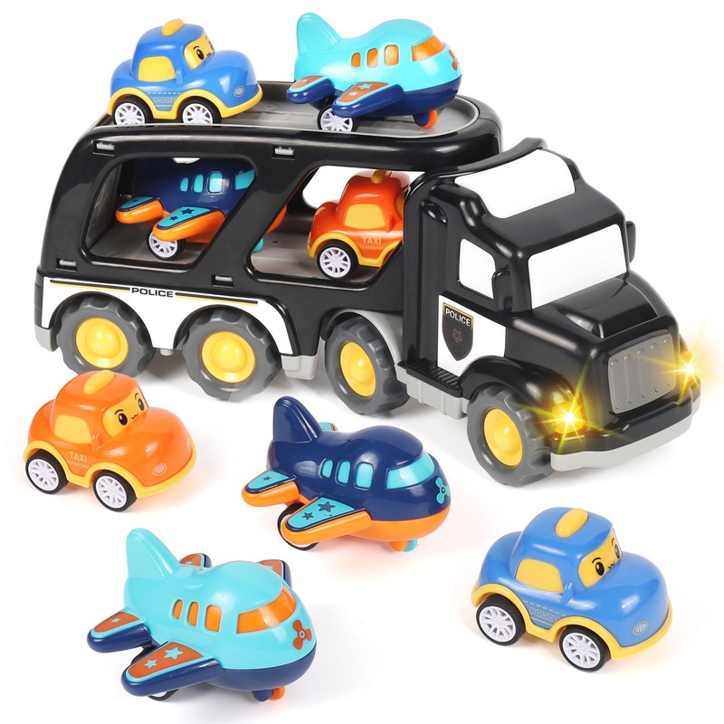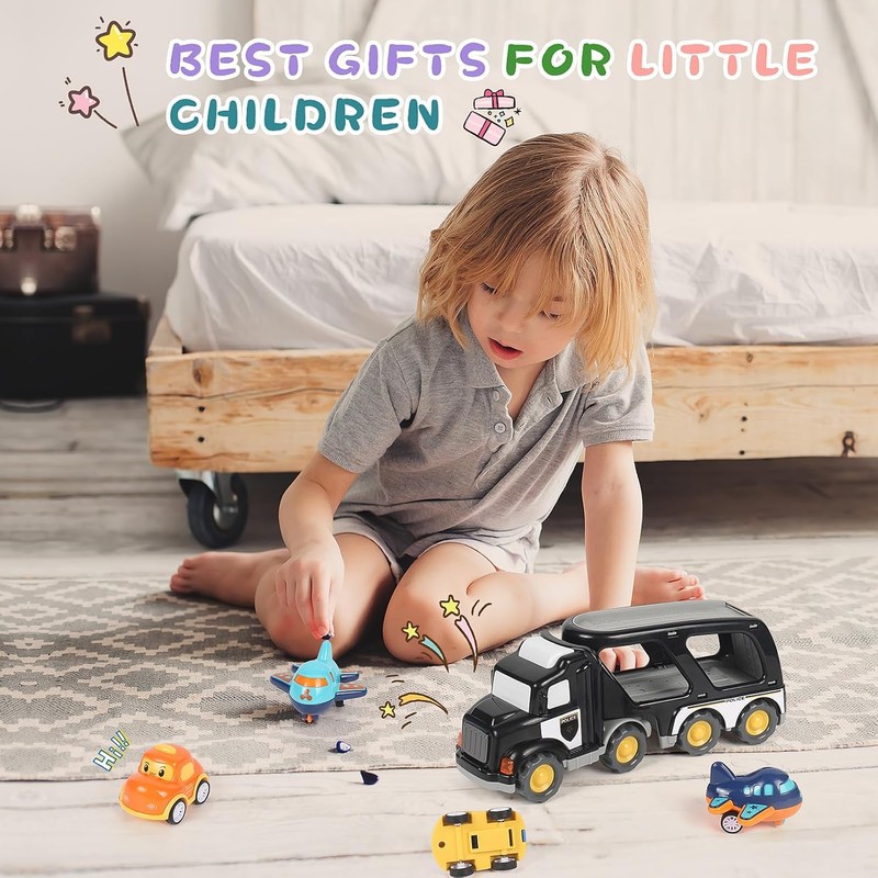 - 5 in 1 car toy set - Transporter with 4 mini pull-back cars: This toy car set contains a robust black car transporter (28 x 9 x 10 cm) and four colourful mini pull-back cars. Simply pull back, release - and the small cars roll independently over long distances. Ideal for creative play hours full of action and fun