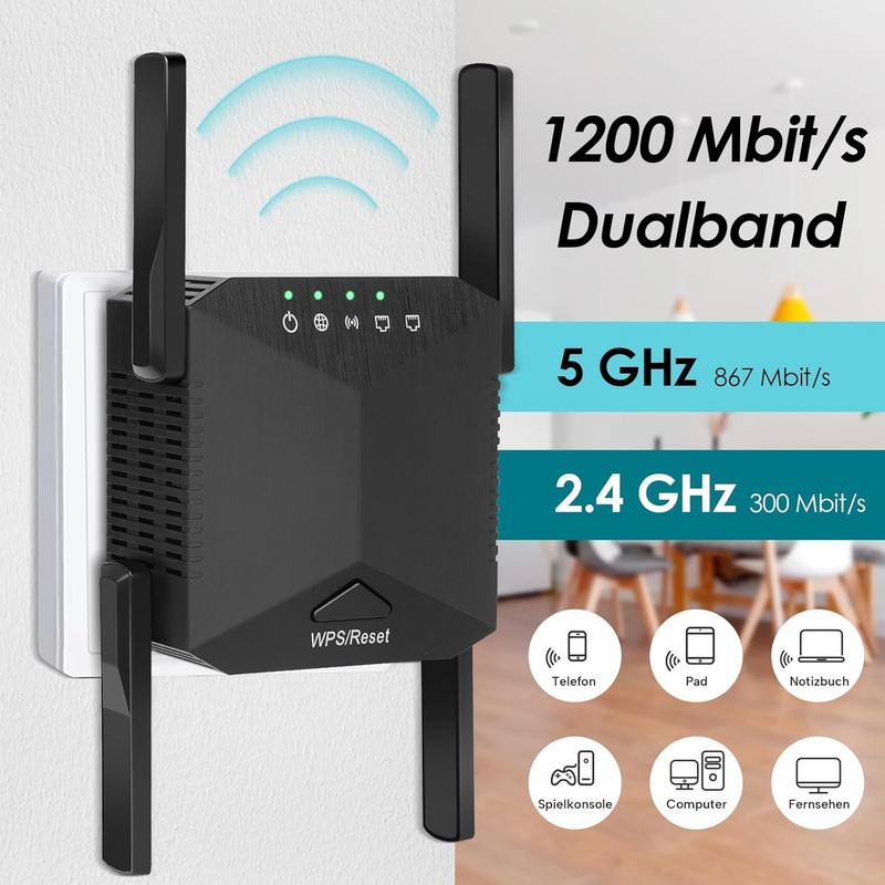 - 1200 Mbps stable signal: WLAN repeater with the latest dual band technology and 2.4/5 GHz intelligent processor, extends the network up to 1200 Mbps. You can confidently stream HD video, play games and video conferencing in your home.