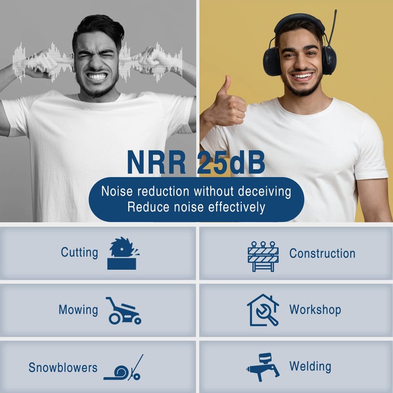 - Unrivaled Active Noise Cancelling: NRR 25dB/SNR 30dB-Backed by Certified Protection of ANSI S3.19-1974 (American national standards Institute) and CE EN 352-1 (European standard). No matter mowing noise, electric welding,construction and other noisy environments, you can focus on what you want to hear.