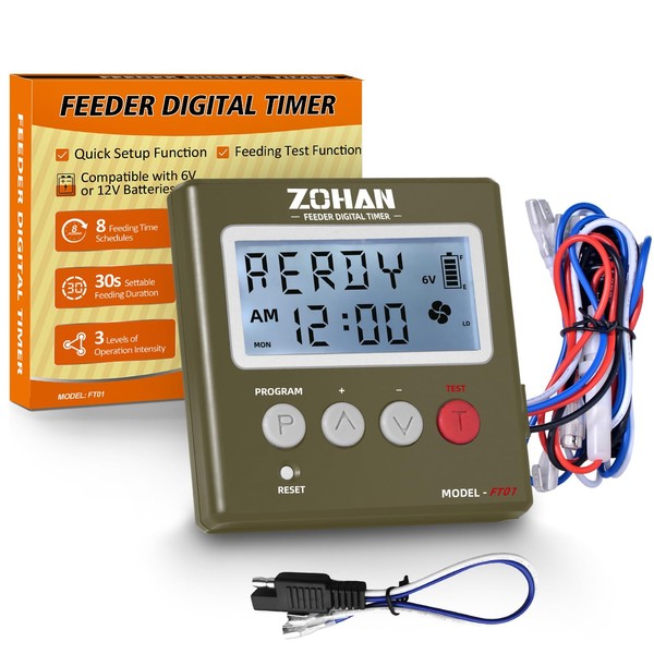 - WHY CHOOSE ZOHAN DIGITAL FEEDING TIMER? - This programmable deer feeder timer is compatible with most 6V/12V feeder kits, featuring customized feeding schedules with precision timing. Precise feed time control (1s-24h) with quick-adjust scheduling and test mode functionality makes this programmable deer feeder timer a must-have hunting accessory built for all-weather reliability