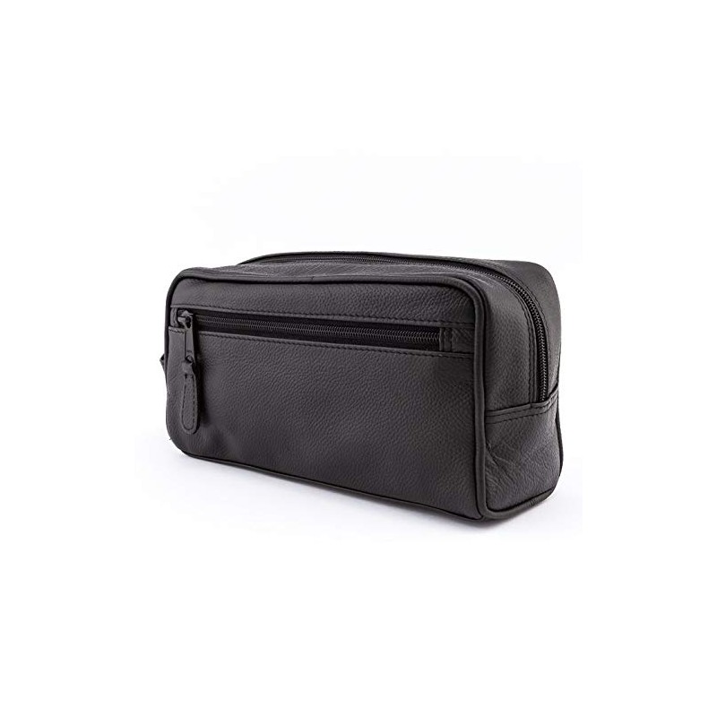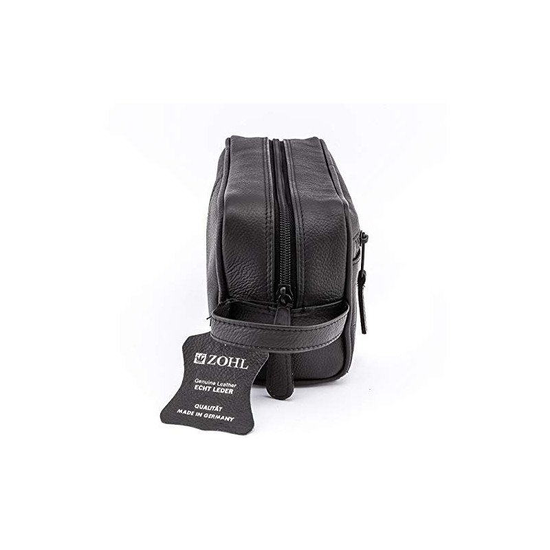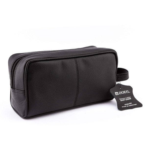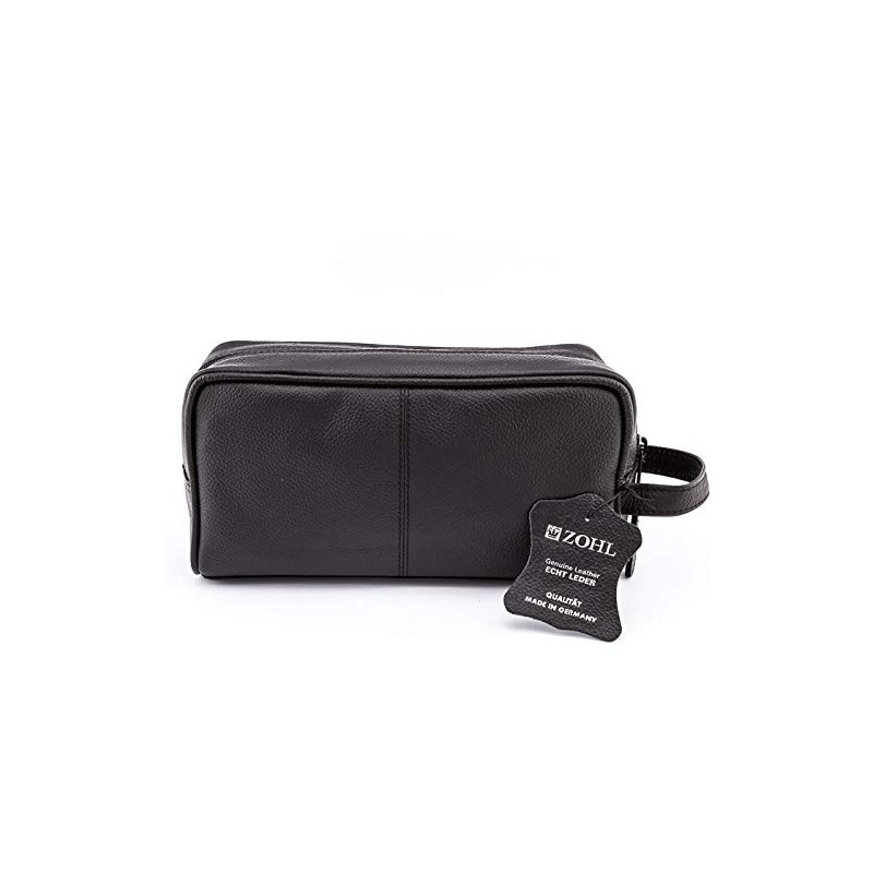 - MADE IN GERMANY FROM SOFT BLACK COWHIDE WITH A ZIPPED OUTSIDE POCKET. Excellent classic toiletries bag for essential travel and shaving gear.
