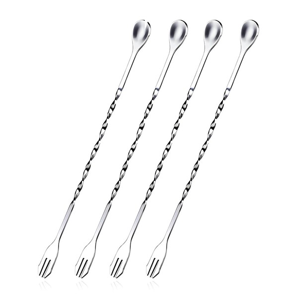 ZOKJSW Cocktail Spoons, Bar Spoons, Stainless Steel, Cocktail Mixing Spoon, Fork, Long Spiral Pattern, Cocktail Mixing Spoon, Set of 4