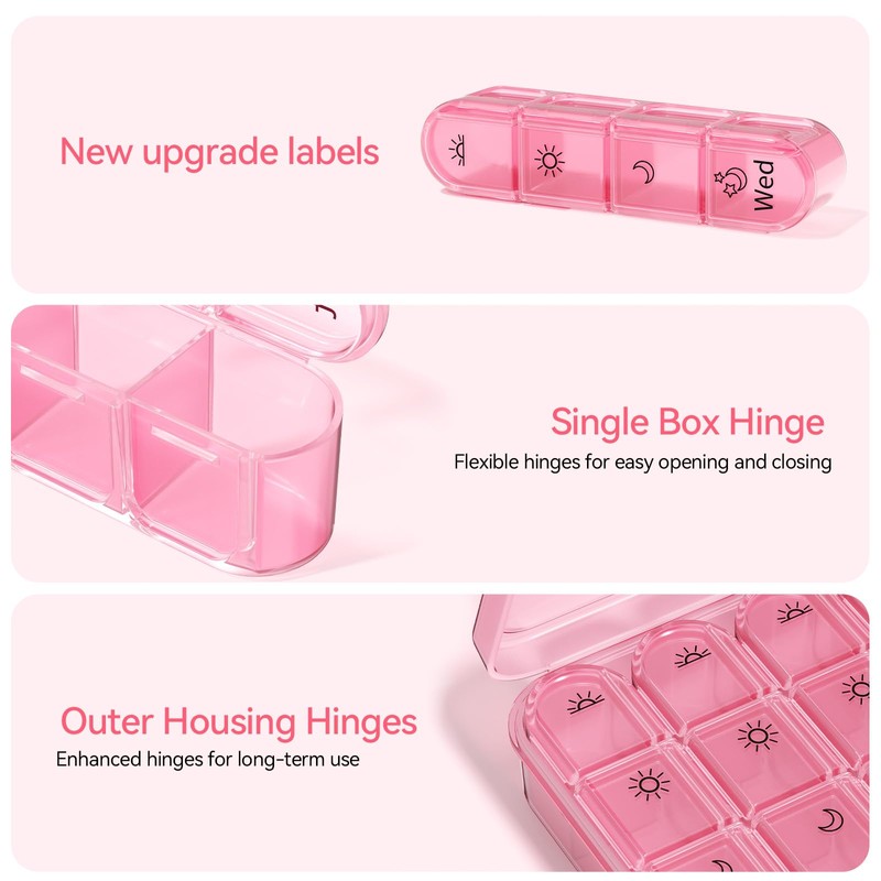 This pill organizer is perfect for a variety of everyday scenarios. Imagine you're rushing out the door in the morning for a busy day at work or on a weekend getaway. With its detachable daily pill boxes, you can quickly grab the exact pills you need for the day and slip them into your bag or pocket, ensuring you don’t miss a dose. Whether you're traveling or simply heading out to run errands, the compact, lightweight design fits effortlessly into your purse, backpack, or carry-on. At home, the sturdy ABS outer case keeps your medication securely organized and prevents any spills or mix-ups, even if the organizer gets knocked over. The 3D labels remain clear over time, making it easy to track which pill to take when, even after repeated use. Whether you're managing multiple prescriptions or just daily supplements, this organizer provides the perfect balance of convenience, security, and durability for your busy lifestyle.